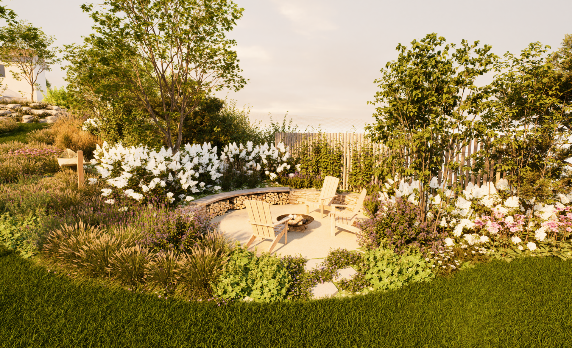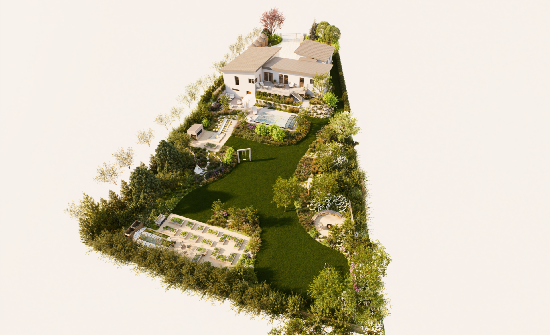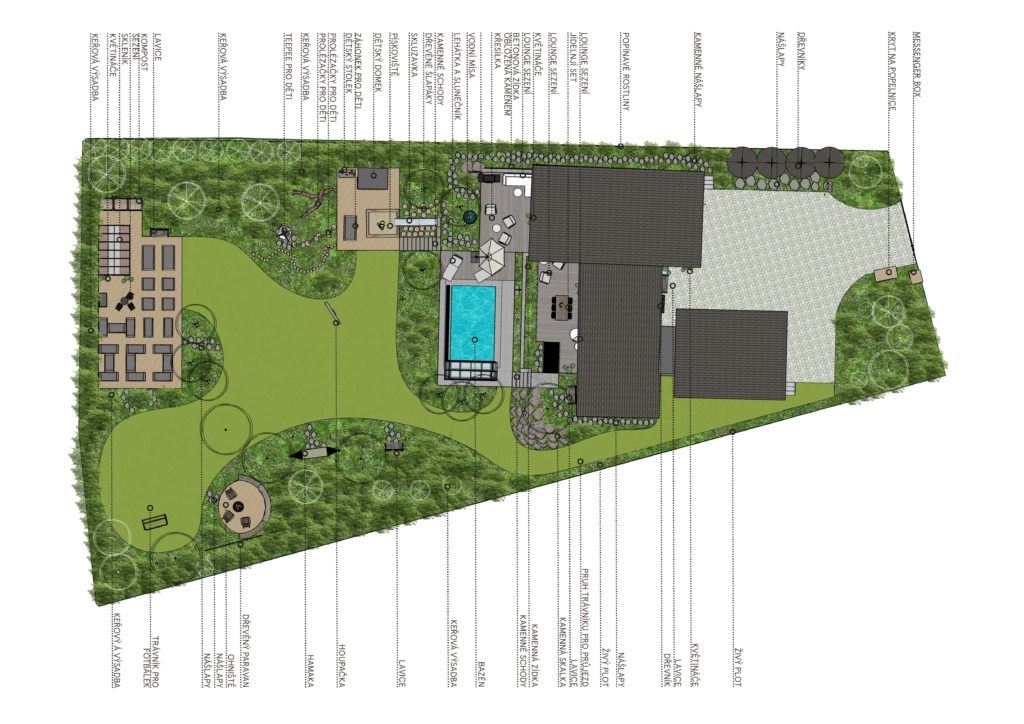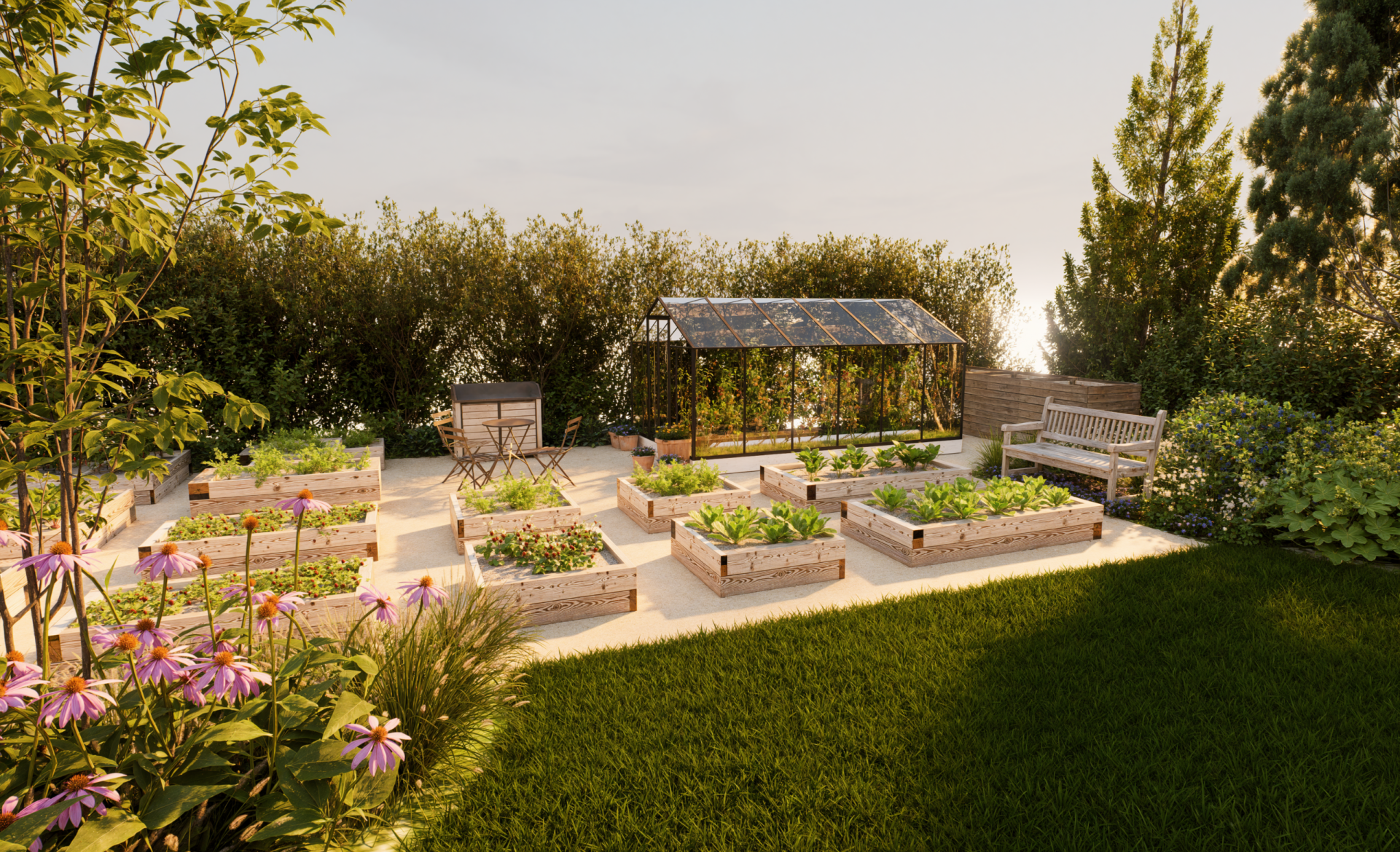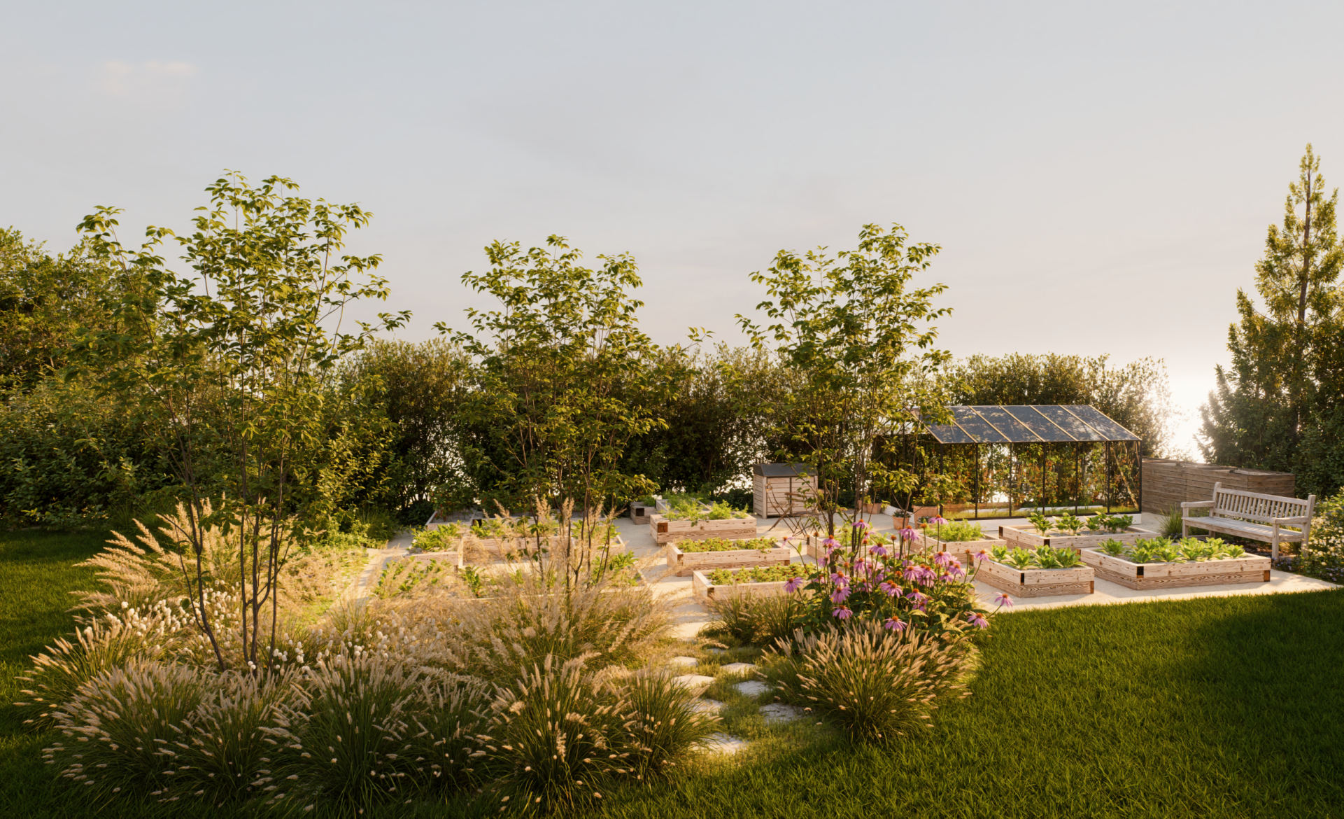 Užitková část zahrady je situována v dolní části pozemku. Je zde navržena plocha s vyvýšenými záhony, skleníkem a kompostem, doplněná o ovocné keře, jahodníky a lavičku k posezení. Celá užitková zóna je obklopena zelení s vícekmenovými stromy, které ji přirozeně začleňují do celkové kompozice zahrady. Výsadbu v této části tvoří převážně keře a polostinná trvalková výsadba, která zajišťuje estetickou hodnotu i funkčnost prostoru po celý rok.