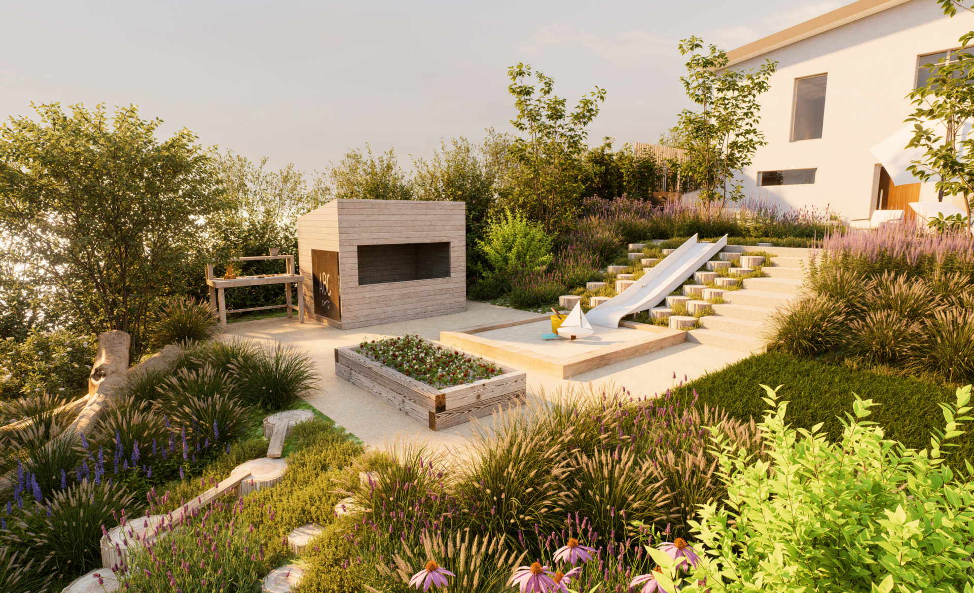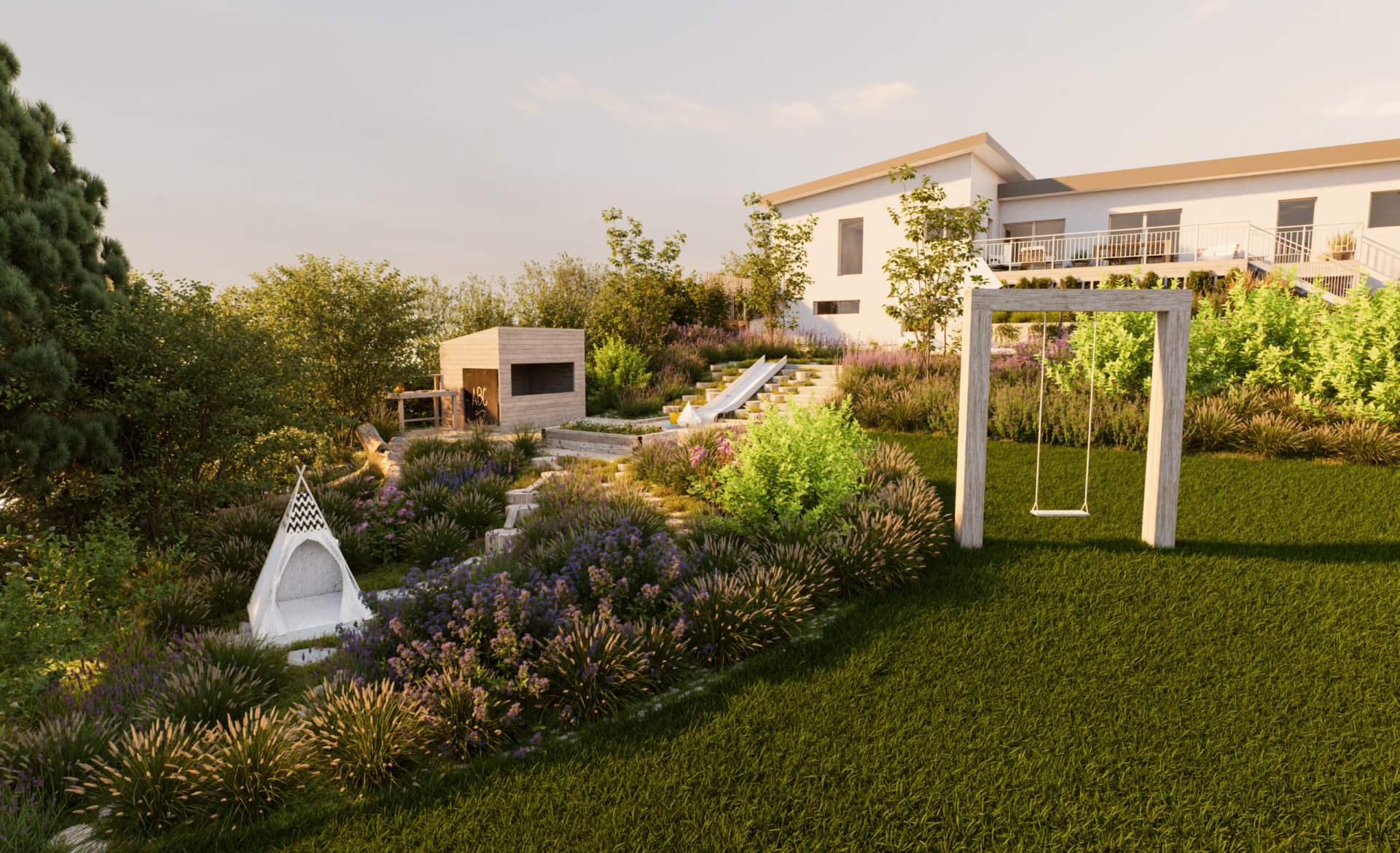 V této části zahrady je situován také dětský pokojíček, do kterého vedou kamenné schody z hlavní terasy. Prostor je vybaven herními prvky, jako je skluzavka, prolézačky, teepee, dětský domek, vyvýšený záhon a houpačka umístěná v trávníku, čímž vzniká plnohodnotná zóna pro dětské hry.