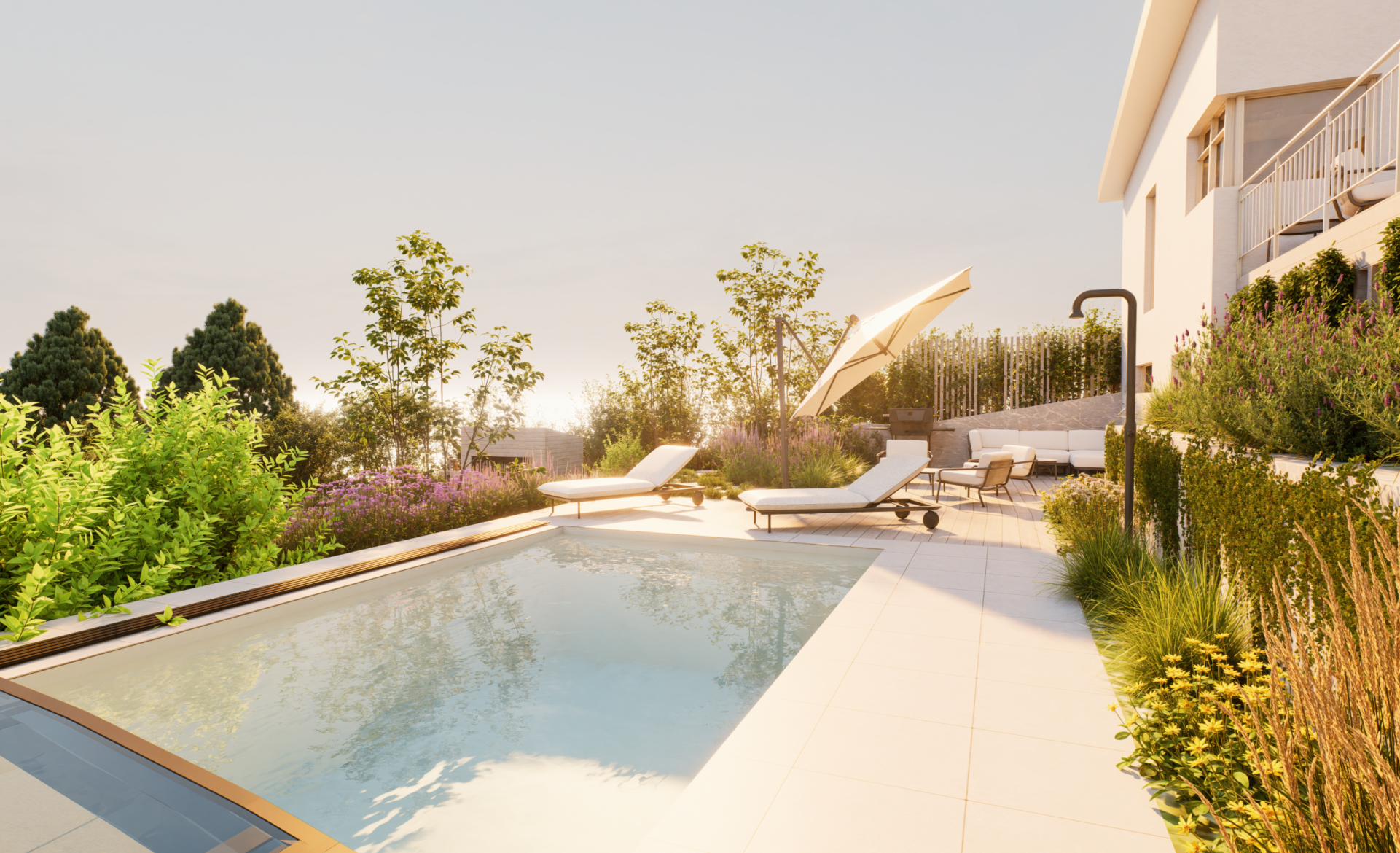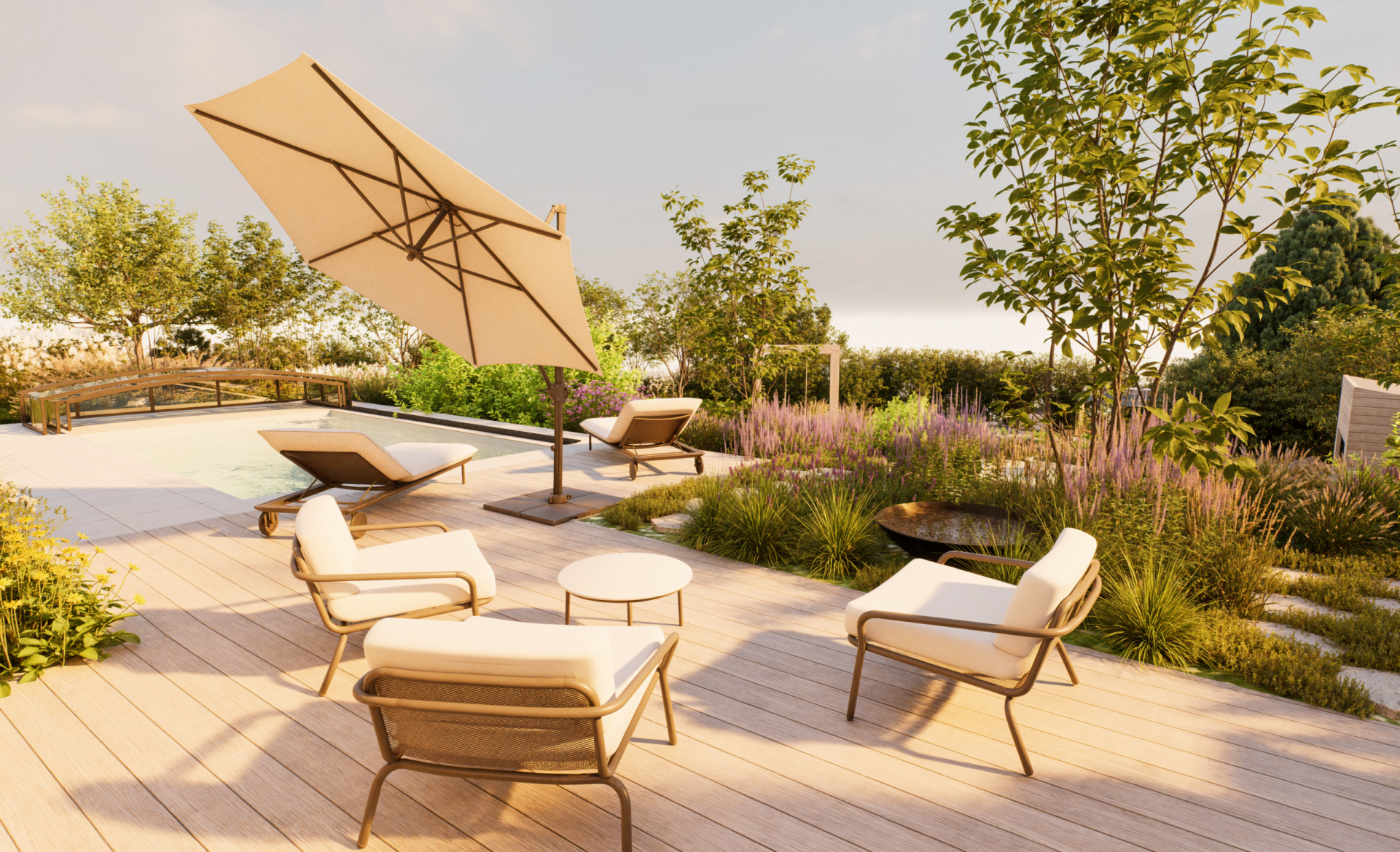 Centrální část zahrady tvoří hlavní pobytový prostor. Dominantním prvkem je dřevěná terasa navazující na obytný prostor domu, doplněná o bazén a menší terasu s lehátky. V blízkosti bazénu je navržena venkovní sprcha. Terasa je orientována na jih, proto jsou v jejím okolí umístěny vícekmenové stromy, které v letních měsících poskytují částečné zastínění a zároveň pomáhají odclonit pohledy ze sousedních zahrad. Součástí centrální části je také terasa v prvním patře domu, vybavená sezením, jídelním setem a květináči, které prostor zútulňují. Pod hlavní terasou vzniká místo pro uložení dřeva, které je od pohledů zakryto dřevěným paravánem porostlým popínavou zelení.