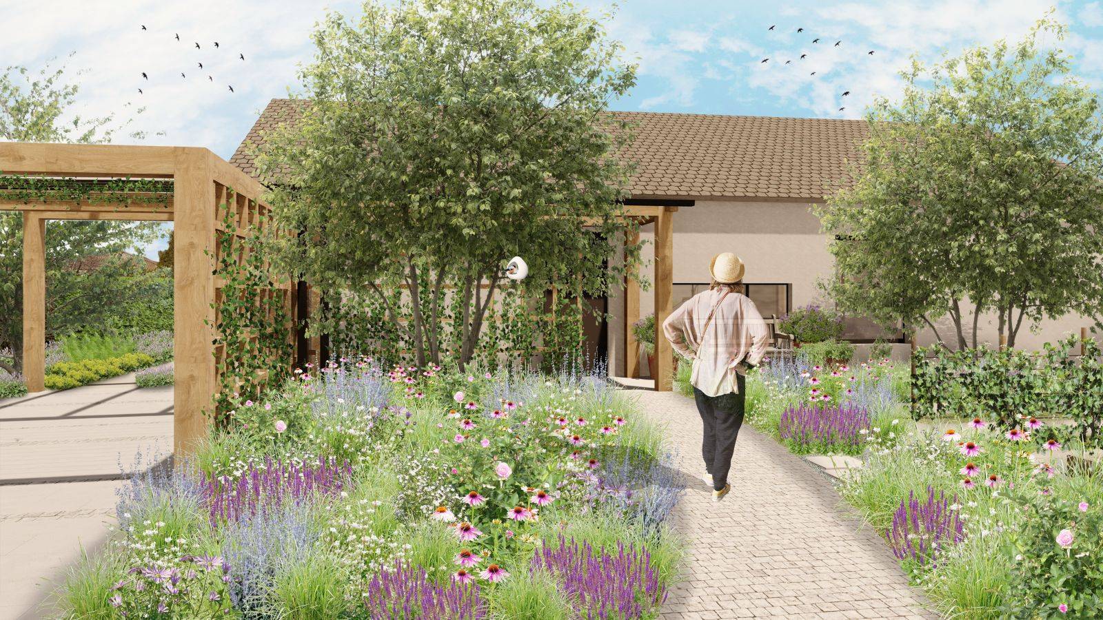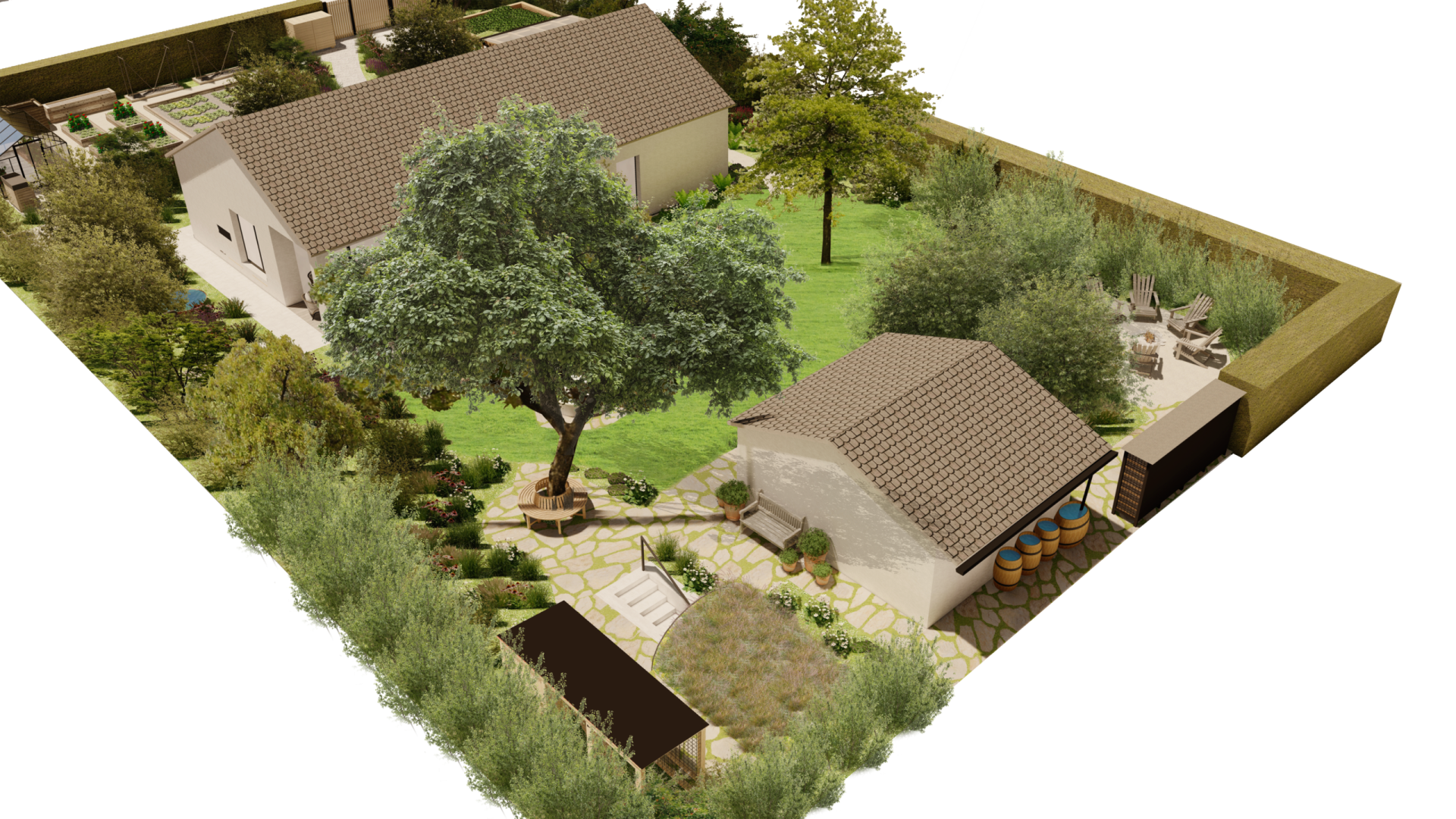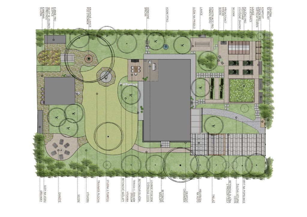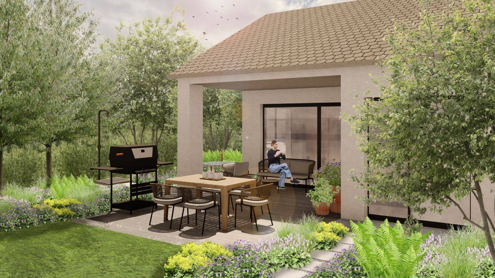 Hlavní pobytový prostor u domu tvoří velkorysá dřevěná terasa, která nabízí komfortní zázemí pro odpočinek i každodenní využití. Z terasy se otevírá výhled do navazující části zahrady s vodním prvkem v podobě vodní mísy. Pro zajištění soukromí a částečného zastínění jsou v jejím okolí navrženy vícekmenové dřeviny. V úrovni terénu, v rámci trvalkové výsadby, je situována hamaka orientovaná směrem k domu i do zahrady. V blízkosti terasy se nachází také venkovní sprcha.
