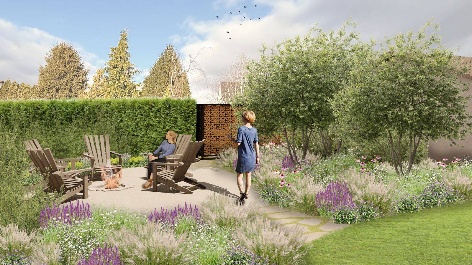 Zadní část zahrady tvoří klidová relaxační zóna s kamenným ohništěm doplněným o volné sezení v podobě křesílek. Součástí této části je také dřevník, který zajišťuje praktické zázemí pro ukládání palivového dřeva.