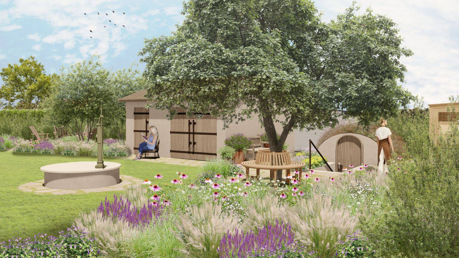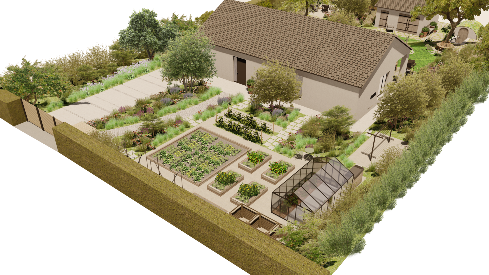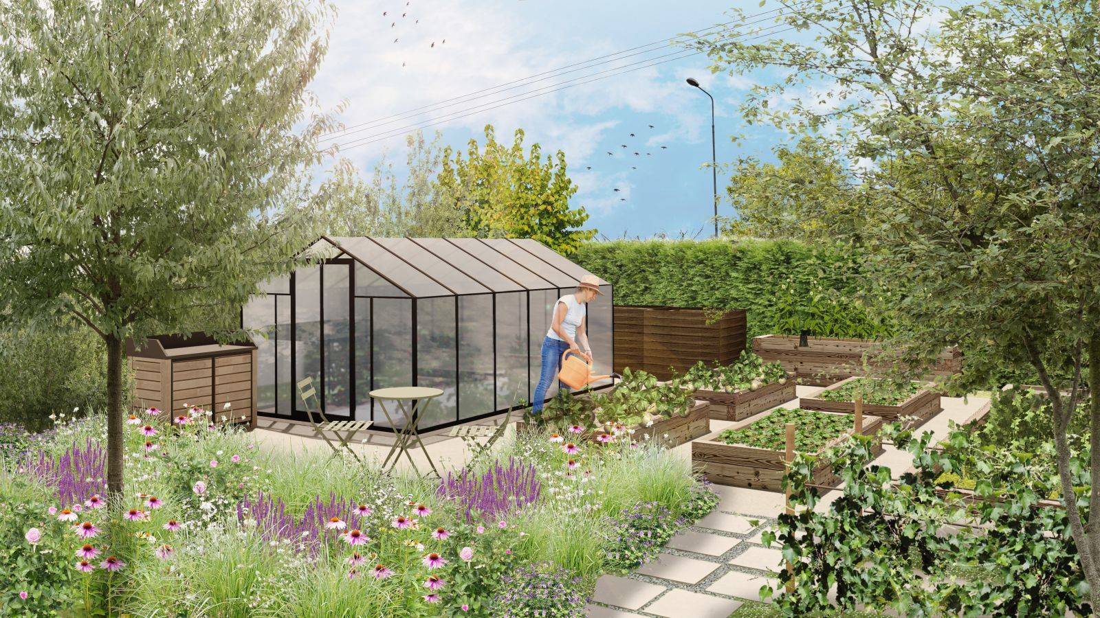 Přední část zahrady je koncipována jako produkční zóna, jejíž dominantou je skleník. V jeho blízkosti se nachází čtyři vyvýšené záhony, doplněné o specializované plochy pro pěstování – záhon pro světelný kořen, záhony pro brambory a cibuli a výsadby maliníků. Pro podporu pěstování je zde umístěn také kompostér a dvě konstrukce určené pro pnoucí vinnou révu.